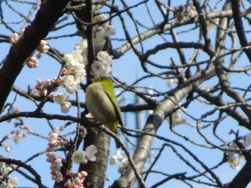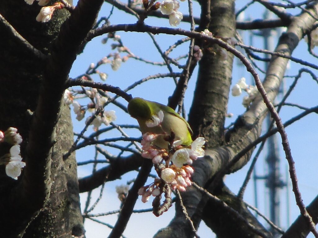 施設の小道では早咲きの桜に、可愛らしいメジロが蜜を吸いにやってきています。