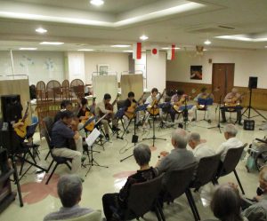 クラッシックギターアンサンブル🎸「ピアチェーレ」の皆さまが、ご来所くださいました😊クラッシックギター🎸の合奏、独奏を通じて、福祉施設や地域団体、地域イベント等で演奏活動をされております🍀「ピアチェーレ」とはイタリア語で「こんにちは」、音楽用語で「自由に、気ままに」という意味があり、「あせらず、ゆっくりボランティア」をモットーに活動されているそうです❗今回、秋🌾の歌を中心に、ご利用者様に馴染みのある歌や演奏を聴かせて頂きました😃お忙しい中、歌詞カードを作成してきて下さり、「赤とんぼ」、「赤い靴」、「夕焼け小焼け」、「高原列車は行く」を伴奏に合わせてご利用者様と歌い🎤、「野ばら」、「夢見る人」、「つぐない」の演奏を聴かせて頂きました😊歌🎤や演奏🎼の間に、「幸せなら手をたたこう」の曲に合わせて、手遊びを行いました😃アンコール曲は、ご利用者様に馴染みのある「もみじ🍁」、「旅愁」を歌い楽しい一時をデイサービス・ご入所のご利用者様と過ごさせて頂く事が出来ました🍀